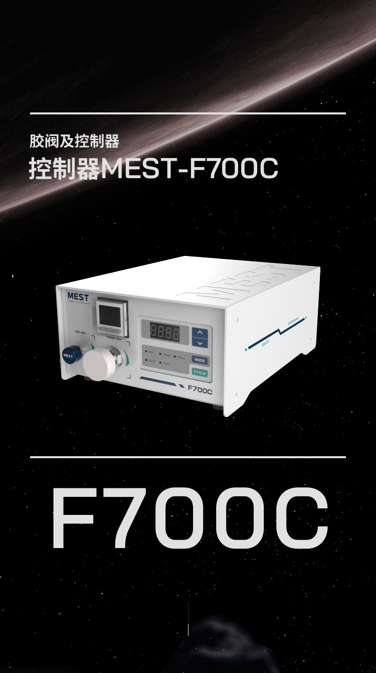 MEST-F700C 高速點膠控制器可控制膠筒進行點膠,具備真空回吸功能,輸入氣壓 0.1-0.8Mpa,氣壓精度可達 0.001Mpa,點膠設時范圍 1.0-9999ms。